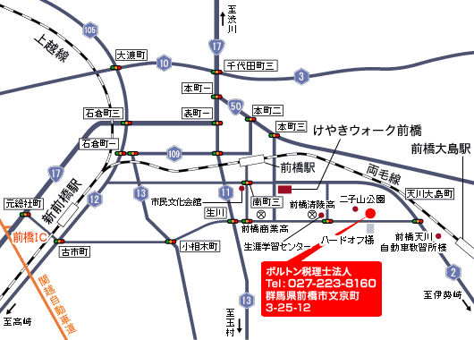 ・前橋ICから国道17号を前橋方面へ。元総社町の交差点を右折し、伊勢崎方面へ約4km。 ・前橋駅南口から南方向へ4つ目の信号を左折し、約2km。 ・前橋駅南口から徒歩30分、タクシー6分。